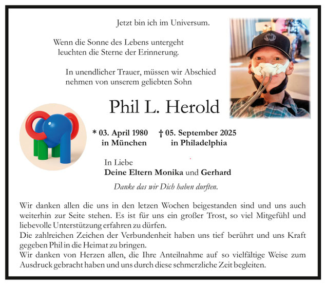 der Abschied von unserem geliebten Sohn Philipp Ludwig Herold findet am Dienstag, den 21.Oktober 2025 um 17 Uhr in seinem Studio München, Kistlerhofstrasse 70, Gebäude 79, II.Stock statt.